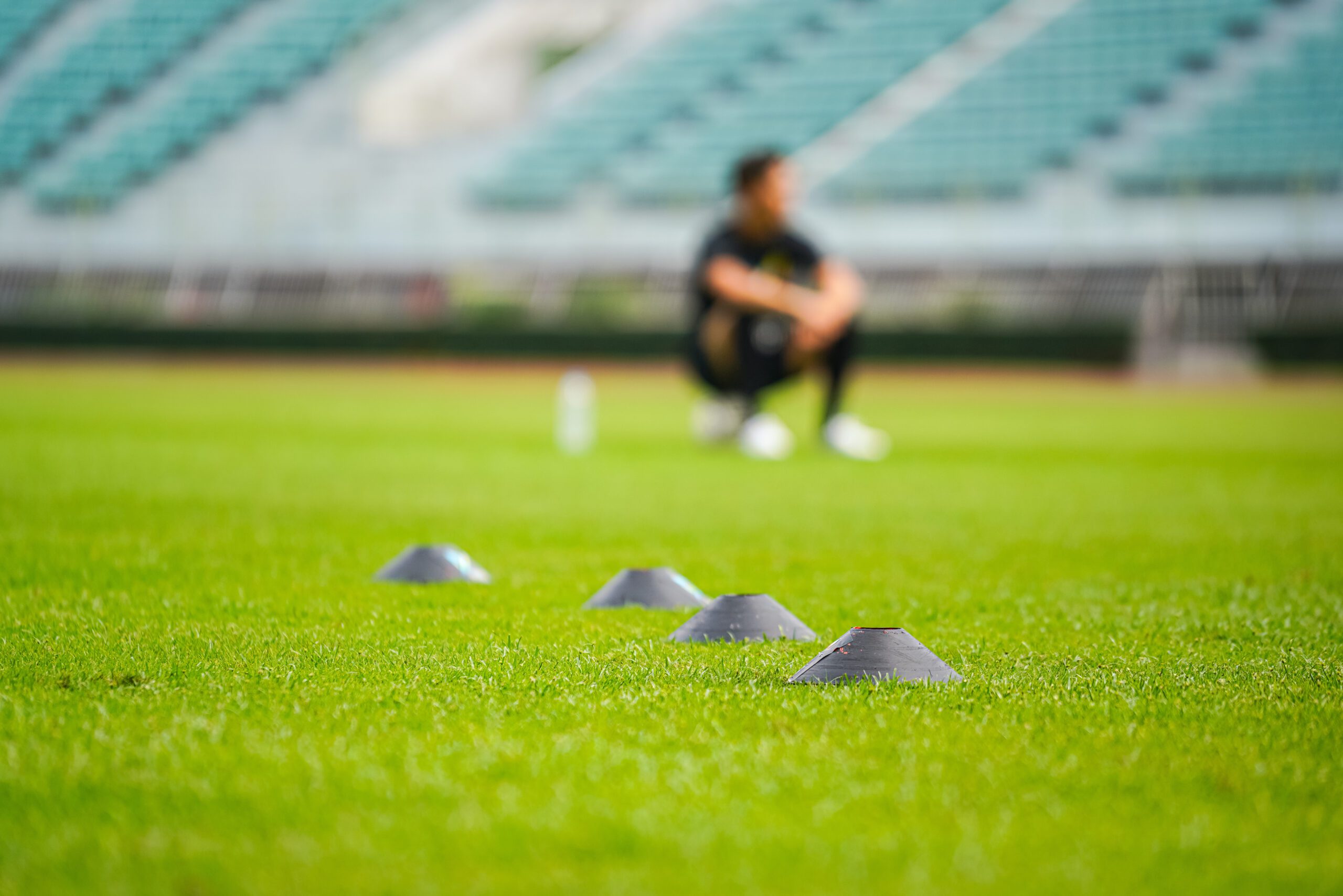 An obstacle cone set on the grass pitch for dribbling training with a player resting as blur background. Professional football training concept, close-up and selective focus on the front cone.
