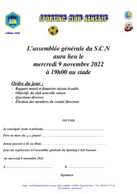 convocation AG du 09-11-2022 Assemblée générale du S.C.N le mercredi 9 novembre 2022 à 19h00 au stade
