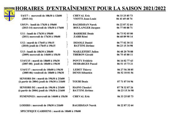 horaires entrainements Publié 4 septembre 2021 à 2338 × 1653 dans Horaires des entraînements 2021-2022 Suivant →