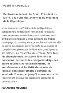 Brèves,Non classé« LA FFF SUSPEND L’ENSEMBLE DES COMPÉTITIONS »…Lire la suite… Bonjour Mrs les Coachs, Mercredi 11 mars 2020 petite réunion à 19h00. Merci Le Stage d’évaluation du 11 Avril 2020 est remis au mois de Mai 2020, à cause du Coronavirus. Merci de votre compréhension.