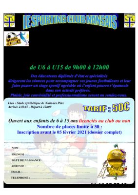 Le Sporting Club Nansais organise un Stage de Football du lundi 22/02 au vendredi 26/02/2021, de 09h00 à 12h00 pour les catégories U6 à U15.