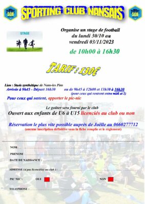 Stage de football du lundi 30/10 au vendredi 03/11/2023